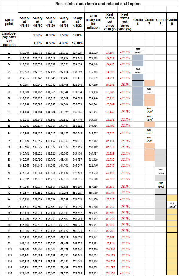 By looking at the University’s own pay spines we can see just how much our pay has fallen in recent years: