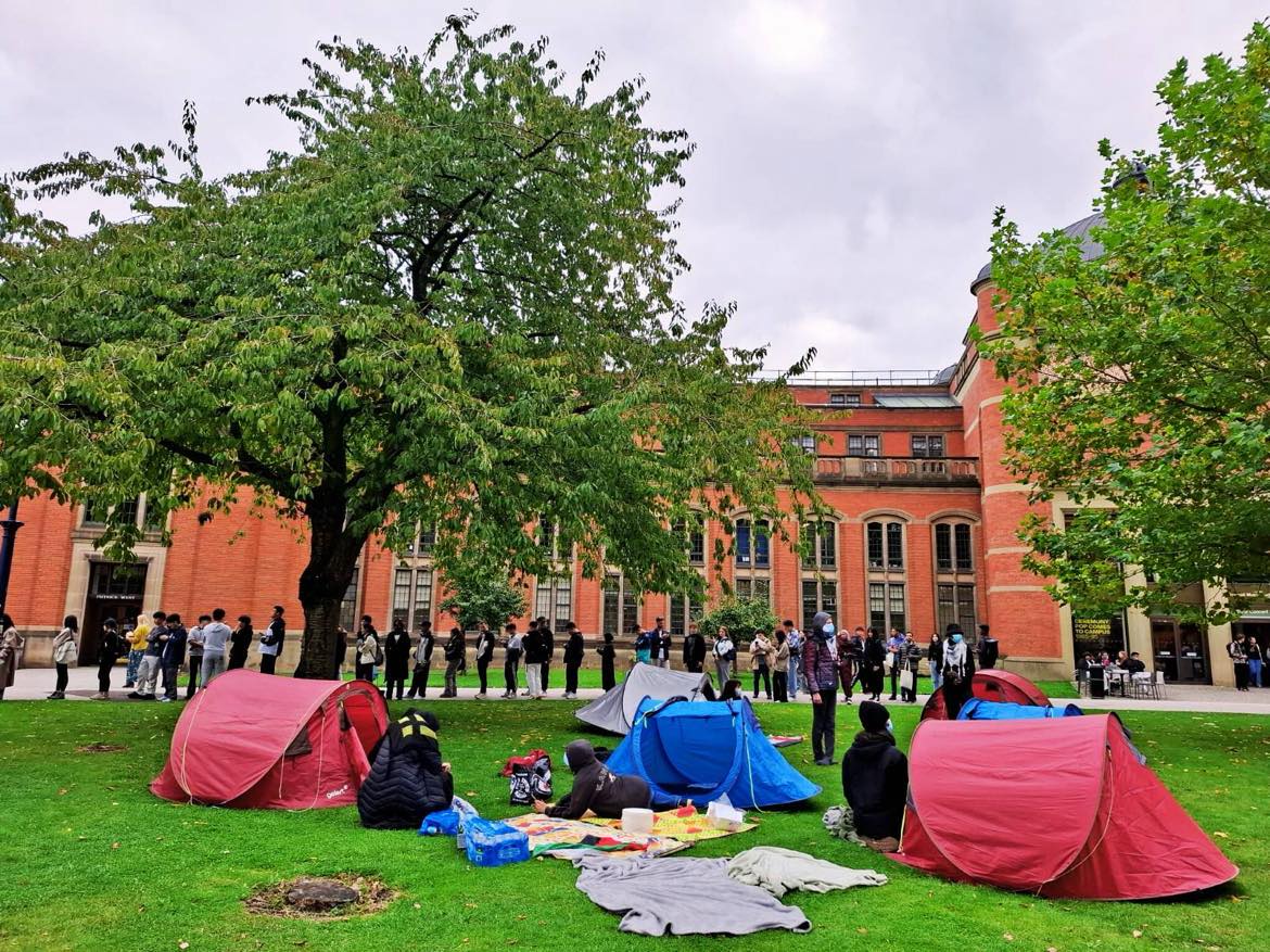 Welcome to the university of Birmingham! A new semester has begun. For newcomers, students and staff alike, this is an exciting opportunity to start a new stage of their learning or to begin a new career. The University has made great efforts to make the beginning of the academic year joyful and welcoming for all. On occasion, this joyful atmosphere was interrupted by a dozen of students whose faces were covered with keffiehs, black and white scarfs symbolising Palestine, chanting slogans asking for our institution to divest from what is now an established fact: an ongoing genocide in Gaza. They were met with a heavy-handed approach from campus security, manhandled and evicted; only to return the next day.